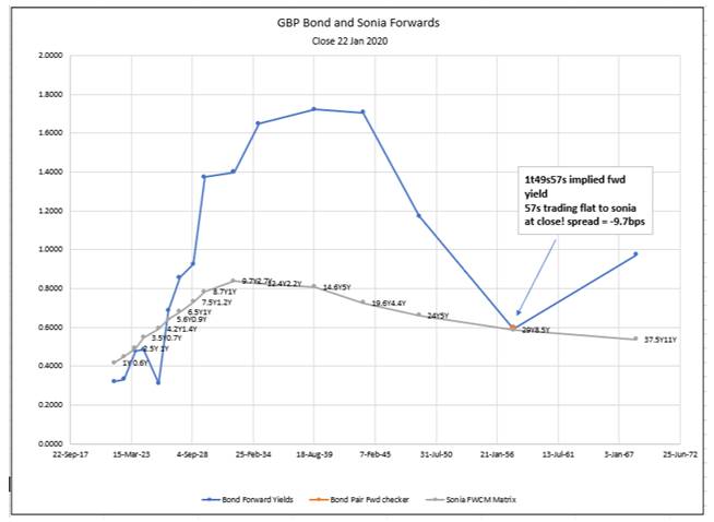 Using the closing levels from last night for the spread at -9.7bps, this puts the implied forwards of the 57s flat to Sonia.