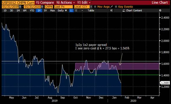 USD Front end: buy 6m2y 1 x 2 payer spread @ zero cost