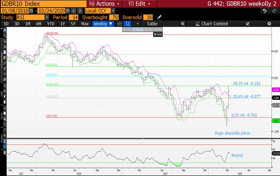 GERMAN YIELD CHART A SPECIAL CASE. **A slightly cloudy picture given we have 2 opposing pierces. Normally in this situation the original downside pierce takes prescience providing we hold the bollinger average -0.510. A breach of the 38.2% ret -0.151 will help a lot.**