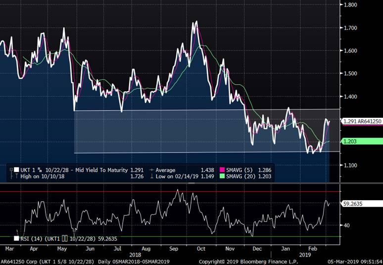 10yr Gilts have given back some of the rally to the highs but the 1.30-35 area looks like key yield resistance on the way up. RSIs suggest 10yr gilts are cheap on a s/term basis but lots of event risk over the next couple weeks…