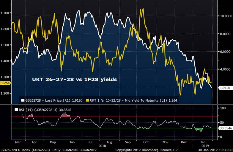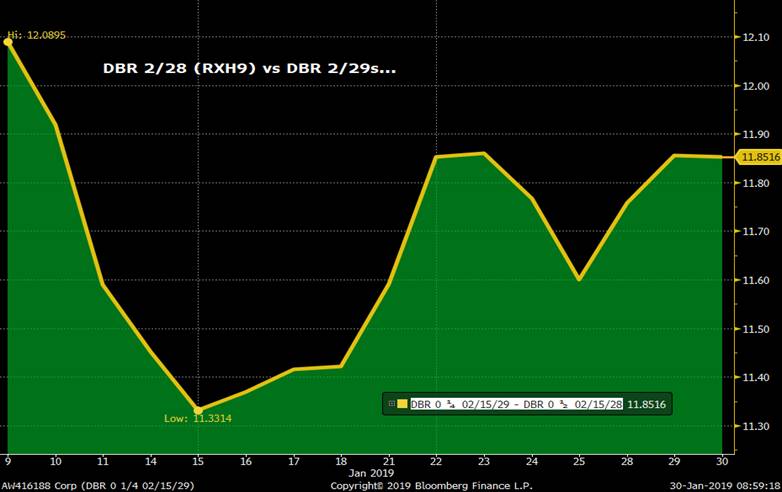 - The DBR 8/28-2/29 roll has steepened into this am’s tap which should attract some forward roll interest given the large index extension in Germany tomorrow of .22yrs. There are a bunch more taps of the DBR 2/29s to come, however, this is an easy, low risk way to grab a bit more risk for EGB players. The DBR 8/28s won’t be CTD into RXU9 so less risk of them vanishing. We’d also expect some interest to buy the DBR 2/29s basis vs RXH9.