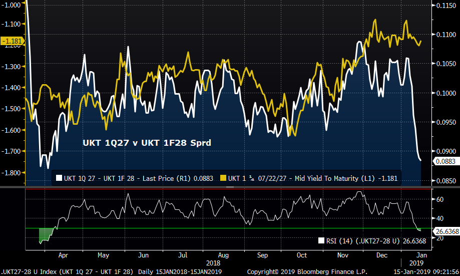 > Our concerns, as we head into the 'Meaningful Vote' is the 1F28s are now a crowded long, held by the majority of our clients in various fashions. If, by some shock outcome, gilts sell-off sharply, we'd expect these sprds to re-steepen. In other words, if you've had the flattener on vs 4Q27 and/or 1Q27 and 1H26s, we think it's time to take 1/2 the posn off and book some nice profits. Conversely, these steepeners also look like good tactical bearish positions if you need that exposure.