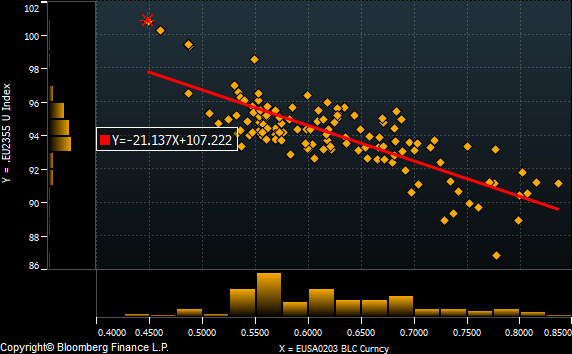 Generally the gradients of the Euro issuers tend to be a simple multiple of the more secure, richer issuers – in this case Germany. France is about 44% steeper than the German curve. A fear of reduced PSPP buying has led to this extreme state notable in the back end. It would imply an ever increasing prob of default of France relative to Germany in the long end. This contrasts with say Italy, where if default or Euro break down is expected, it’s expected to occur predominantly in the first ten years.