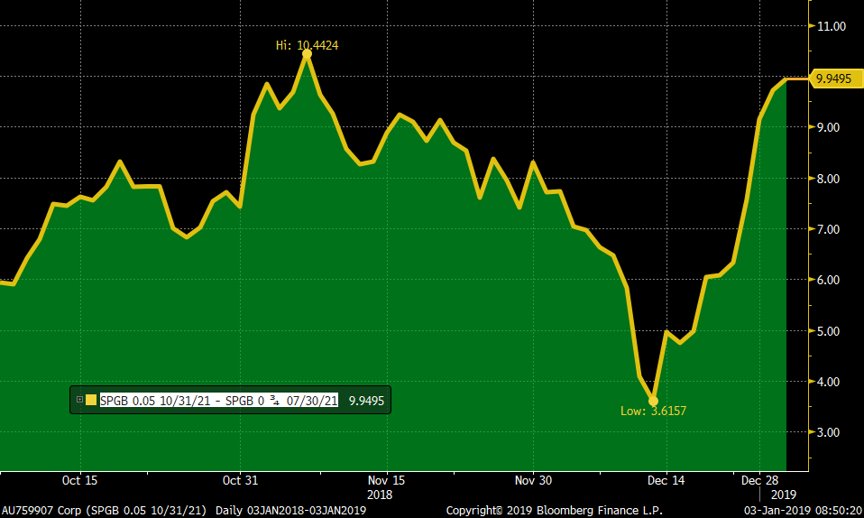 > Between the political rumblings of the past month and continued equity mkt wobbles, SPGBs have cheapened vs DBRs, about 10bps in 10yrs over the last week.